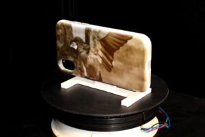 L’oggetto che deve essere decorato viene ricoperto dallo speciale inchiostro che, una volta colpito dalla luce ultravioletta, si modella facendo comparire l’immagine creata al computer o la gradazione di colore desiderata.